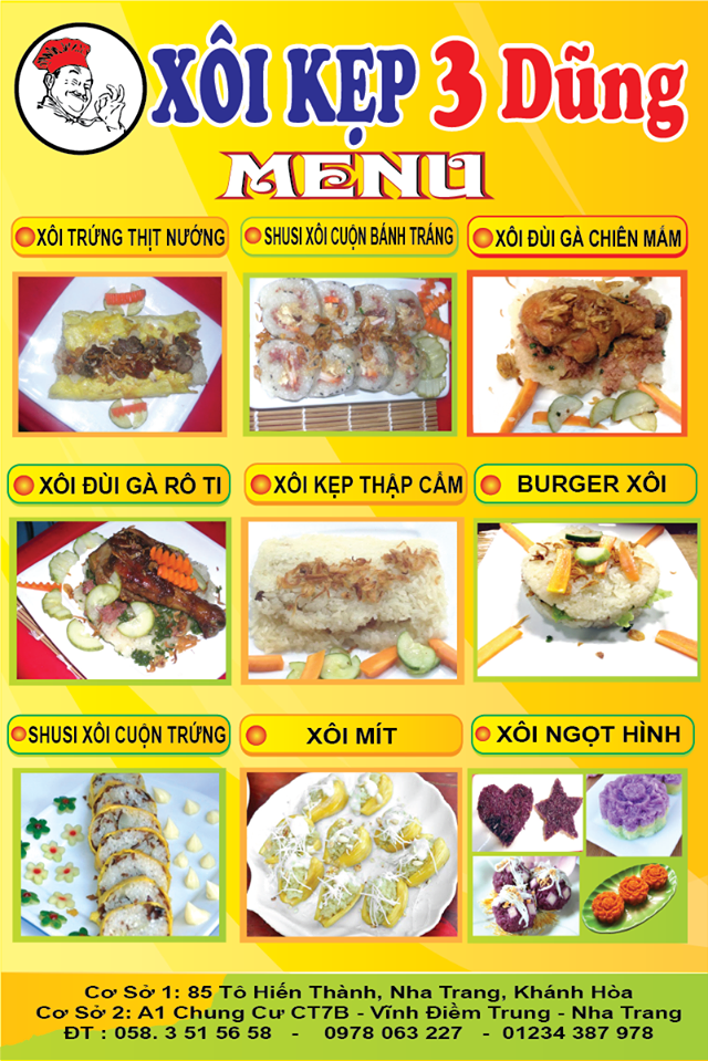 Nếu đã chán ngấy với các loại xôi truyền thống như xôi khúc Nha Trang, xôi cút trứng non Nha Trang… thì mọi người có thể ghé đến quán xôi kẹp 3 Dũng thưởng thức những phiên bản xôi độc lạ như xôi mít Nha Trang, xôi ngọt hình,… Menu đa dạng, giá cả bình dân và hương vị thơm ngon là những lý do đủ để thực khách lưu quán vào top những quán xôi Nha Trang nhất định phải thử khi đi du lịch đến miền đất này.