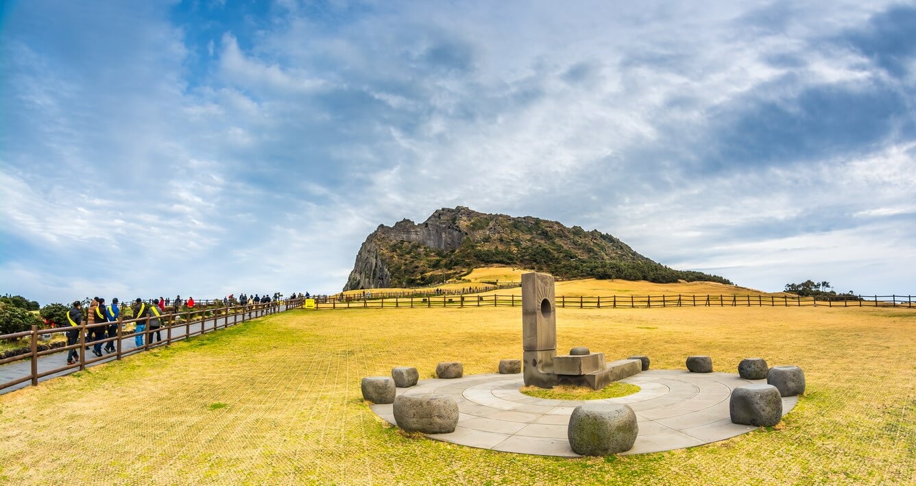 ●      Đỉnh Seongsan – Ilchulbong: cao 180m so với mực nước biển do dòng magma dưới đáy biển cách đây 5000 năm. Đây là một điểm đến lý tưởng cho những ai yêu thích sự lãng mạn. Còn gì tuyệt vời hơn khi được ngắm mặt trời mọc từ miệng núi lửa yên bình, đón chào những tia nắng bình minh trên cánh đồng cỏ xanh ngát với tiếng rì rào từ sóng biển.